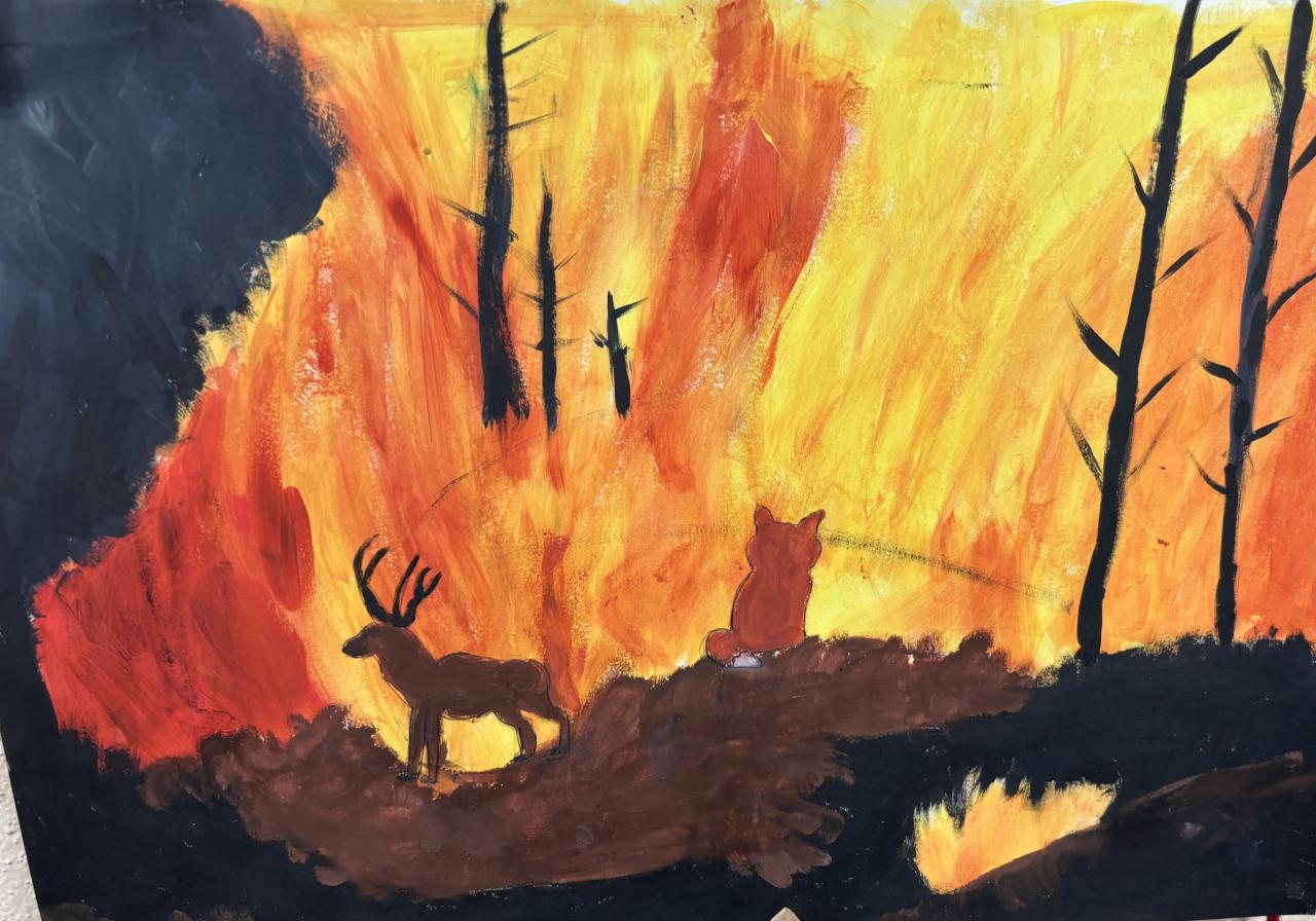 Mnoho prací bylo velmi zdařilých, ale jeden obrázek na první pohled vynikal - v úterý 10.3.2026 se naše žákyně Eliška Konárková zúčastnila slavnostního předávání  cen v Jihočeské vědecké knihovně v Českých Budějovicích - zvítězila v kategorii 5. a 6. tříd s výtvarnou prací na téma „ Požár v lese“.
